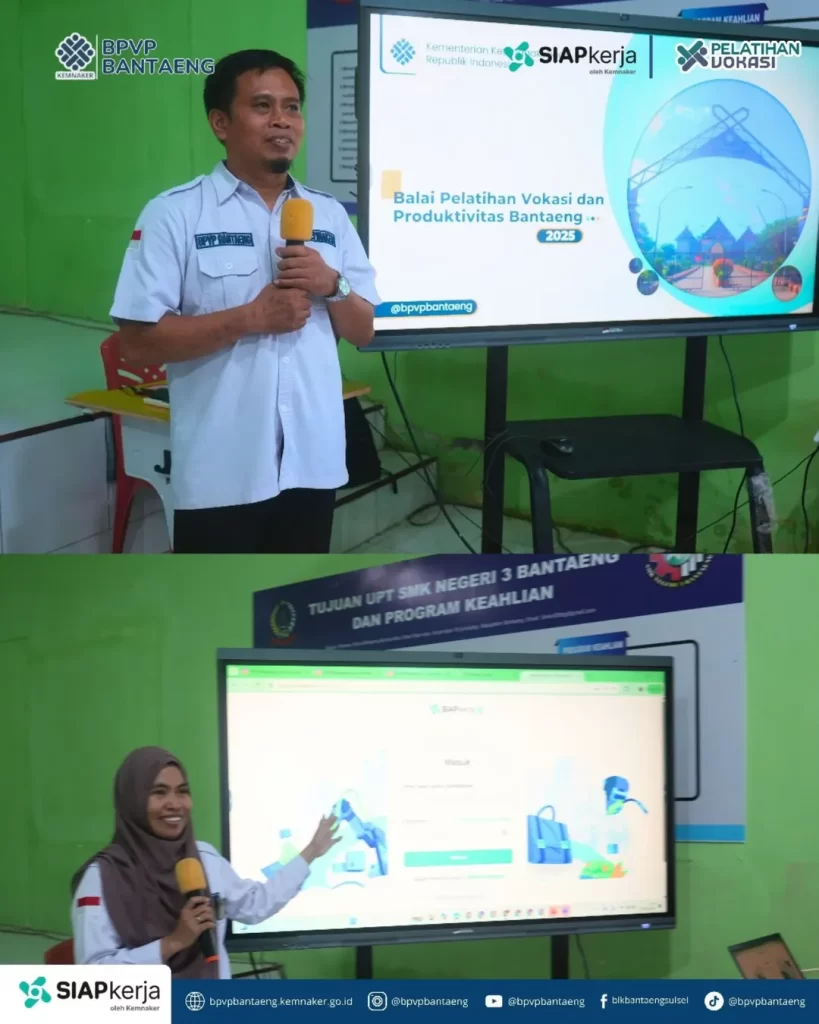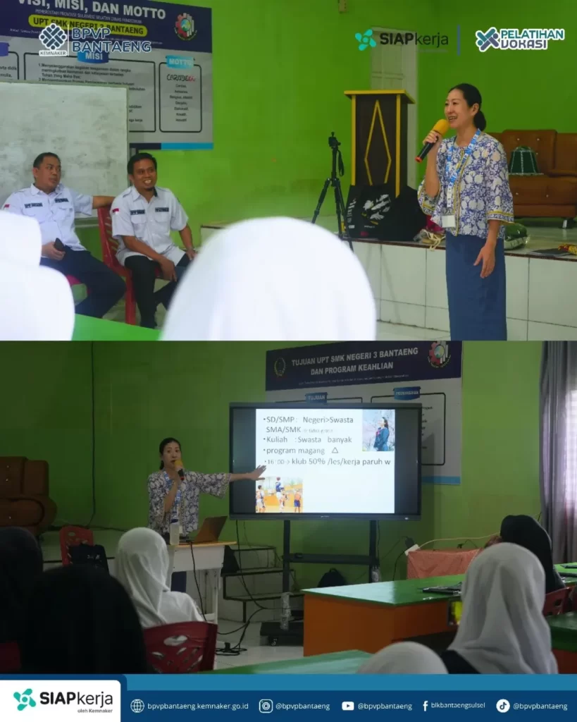 Kegiatan dilanjutkan dengan pemaparan informasi seputar program pelatihan kerja di BPVP Bantaeng oleh Instruktur Kejuruan Otomotif, Bapak Andi Abdur Rahman, S.T.,M.Pd. Setelah itu, Bapak Sapri, S.T., selaku Subkoordinator Bidang Produktivitas, menyampaikan sosialisasi terkait program pemagangan ke Jepang yang merupakan kerja sama antara Kementerian Ketenagakerjaan RI dan IM Japan, serta memperkenalkan SIAPKerja sebagai portal resmi layanan ketenagakerjaan dari Kemnaker.